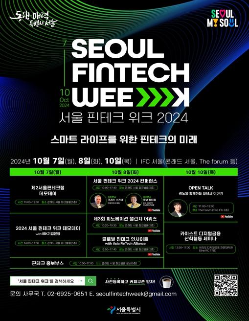 ‘서울 핀테크 위크 2024’는 핀테크 분야 특화 국제 행사로 글로벌 디지털금융 전문가와 금융기관 관계자, 국내·외 빅테크·핀테크 기업과 국내?외 투자자 등 업계 관련자가 한자리에 모이는 행사로 10월 7일, 10월 8일 및 10월10일 여의도 콘래드 서울 호텔 등에서 개최된다.