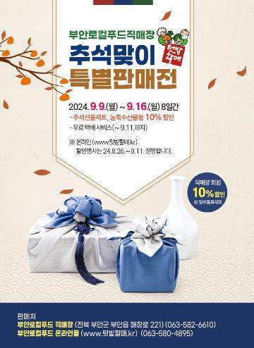 이번 특판행사는 부안에서 생산되는 우수 농·축·수산물과 추석선물세트 70여종을 10% 할인된 가격에 판매한다.