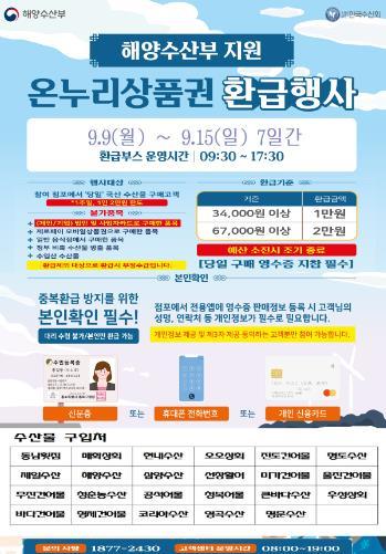 행사 기간 중 수산물을 3만 4천 원 이상 6만 7천 원 미만 구매시 1만 원, 6만 7천 원 이상 구매시 2만 원을 온누리상품권(지류형)으로 환급받는 행사로 당일 본인 신분증 및 구매 영수증을 바지게시장 내 환급처에 제시하면 된다.