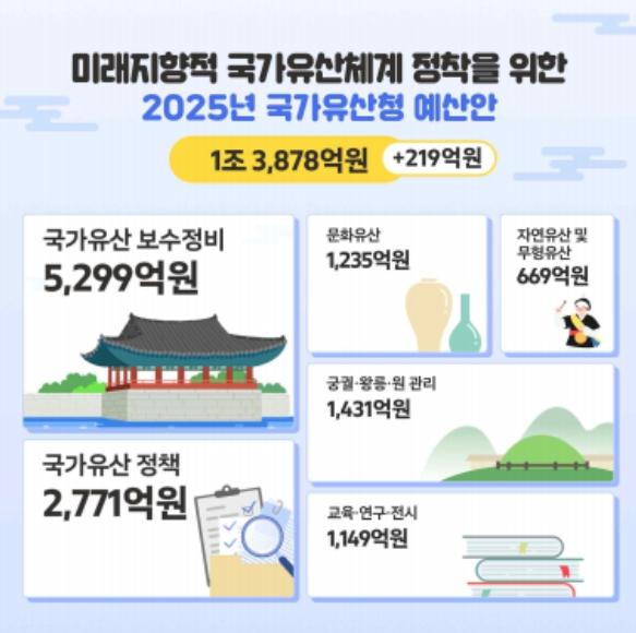 국가유산청의 2025년도 정부안 예산규모는 1조 3,878억 원으로, 2024년 예산(1조 3,659억 원) 대비 219억 원(1.6%) 증액됐다. 분야별로는 ▲ 국가유산 보수정비 5,299억 원, ▲ 국가유산 정책 2,771억 원, ▲ 문화유산 1,235억 원, ▲ 자연 및 무형유산 669억 원, ▲ 교육·연구·전시 1,149억 원, ▲ 궁능원 관리 1,431억 원 등의 예산을 투입할 예정이다.