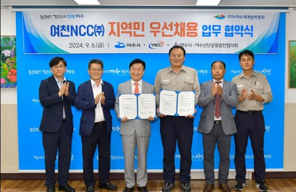 여수시가 지난 6일 오후 시장실에서 여천NCC㈜와 ‘여수산단기업 지역민 우선채용’ 협약을 체결했다.