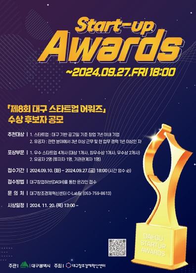 대구광역시는 지역경제산업의 뿌리인 창업기업의 발전과 육성에 기여한 공로자를 포상하기 위해 ‘2024년 제8회 대구스타트업어워즈’ 수상 후보자를 9월 27일(금)까지 모집한다.