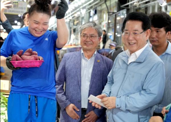 김영록 지사는 이날 영광터미널시장에서 물가관리와 지원정책을 설명하고, 전통시장 상인들이 안정적으로 영업하고 번창하도록 적극 지원할 것임을 밝혔다.