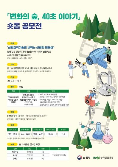 산림청은 한국임업진흥원과 함께 오는 10월 4일까지 ‘변화의 숲, 40초 이야기’ 영상(숏폼) 공모전을 개최한다고 9일 밝혔다.