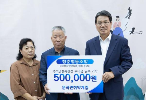 청양군은 청춘협동조합에서 지난 9일 군청 대회의실에서 개최되었던 추석맞이 특판전 수익금 가운데 50만 원을 운곡면 취약계층을 위한 성금으로 기부했다고 밝혔다.