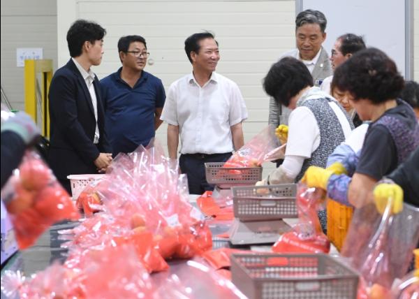 구인모 군수는 이날 추석 성수품 선별장인 남거창농협농산물산지유통센터(조합장 허원길)와 서북부경남거점산지유통센터(대표 김종경)를 방문해 사과 처리 과정과 유통 상황을 점검하고 품질관리 및 유통 활성화 방안을 논의했다.