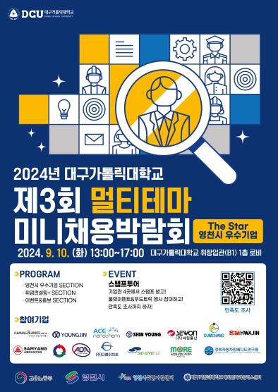 이날 행사는 대구가톨릭대학교가 연중 추진하는 ‘멀티테마 미니채용박람회’의 하나로, 지난해 영천시 12개 우수기업이 참가한 ‘The Star 영천채용박람회’의 성공개최에 힘입어 다시 열리게 됐다.