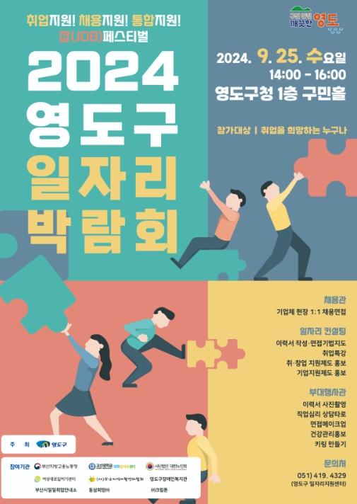 부산시 영도구는 기업의 인력 채용을 지원하고 구직자에게 다양한 일자리 정보와 취업기회를 제공하기 위해 9월 25일 영도구청 구민홀에서 2024년 영도구 일자리박람회를 개최한다.