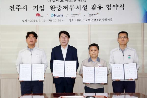 시는 10일 휴비스 전주공장 본관 2층 중회의실에서 우범기 전주시장과 ㈜휴비스·㈜삼양사·삼양화성(주) 등 팔복동 산단에 입주한 3개 기업 대표들이 참석한 가운데 ‘전주 제1·2일반산업단지 완충저류시설 연계 처리를 위한 협약’을 체결했다.