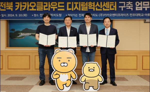 전북자치도는 10일, 김관영 도지사, 카카오엔터프라이즈 이경진 대표이사, 전주대학교 박진배 총장, 아토리서치 정재웅 대표이사가 함께 ‘전북 카카오클라우드 디지털 혁신센터 구축 및 운영에 관한 업무협약’을 체결했다고 밝혔다.
