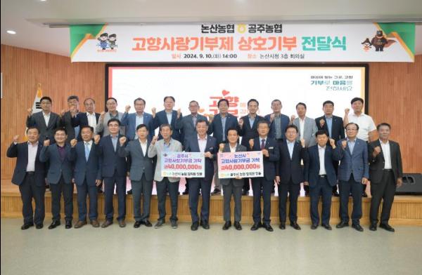 논산시는 지난 10일 공주시 및 논산시·공주시 농협 관계자들이 논산시청을 방문하여 고향사랑기부금 상호교차 기탁식을 진행하고, 시와 농협 간 상생협력 관계를 구축했다고 밝혔다.