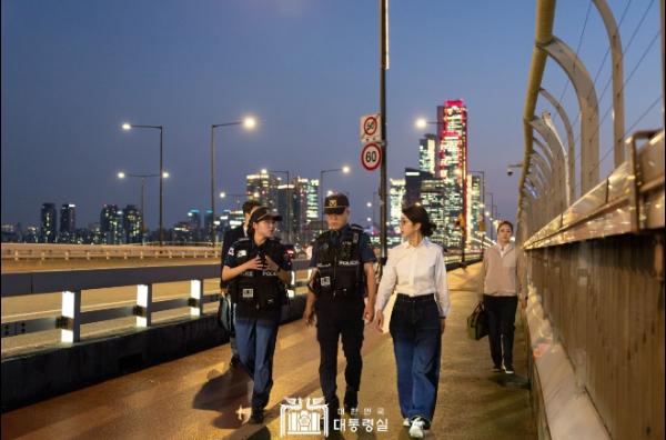 김 여사는 용강지구대 순찰인력과 함께 마포대교 도보 순찰에도 나섰다. 마포대교 난간 등을 직접 살펴본 김 여사는 “자살 예방을 위해 난간을 높이는 등 조치를 했지만, 현장에 와보니 아직 미흡한 점이 많다”며 “한강대교의 사례처럼 구조물 설치 등 추가적인 개선이 필요할 것 같다”고 밝혔다.