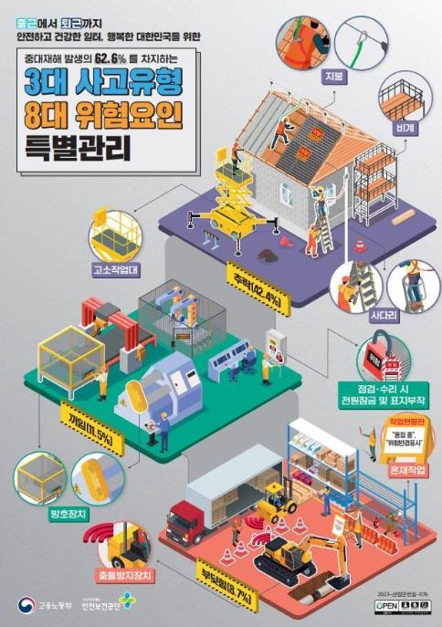 추석 연휴를 앞두고 일정에 맞춰 급하게 작업을 하다 보면 작은 실수가 사고로 이어질 위험이 크므로 전국의 지방고용노동관서 산업안전보건감독관 등은 기본 안전수칙 준수로 예방이 가능한 3대 사고유형 8대 위험요인을 집중 점검한다.
