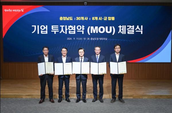 홍성군이 11일 충남도청 대회의실에서 김태흠 도지사와 이용록 홍성군수, 3개 기업 대표가 참석한 가운데 총 220억원 규모의 합통 투자협약(MOU)을 체결했다.
