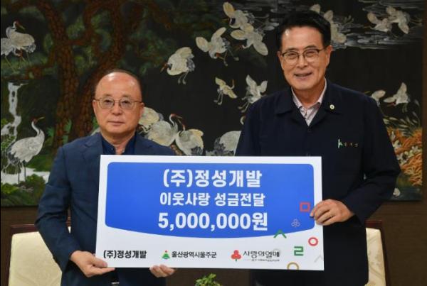 ㈜정성개발이 11일 군청 소회의실에서 이순걸 군수와 정성교 대표, 사회복지공동모금회 울산지회 관계자 등이 참석한 가운데 울주군 저소득세대를 위한 성금 500만원을 전달했다.