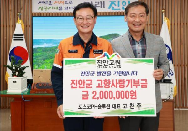 ㈜포스코PH솔루션 고찬주 대표는 지난 11일 진안군수실을 방문해 진안군에 고향사랑기부금 200만원을 전달했다.