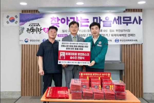 부산지방세무사회는 화재 시 연기흡입을 막아주는 방연마스크 숨수건 150장을 부전상가시장 신영욱상인회장에게 전달했으며 추석을 맞아 장을 보러 온 시민들에게 장바구니 200개를 나눠 주었다.