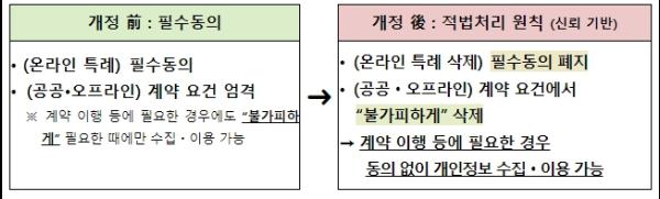 당사자 간 계약에 수반되는 개인정보에 대한 형식적 필수동의는 없애는 대신 동의가 필요한 영역에서는 알고 동의하는 문화를 정착시켜, 정보주체와 기업 모두에게 도움될 수 있는 환경을 단계적으로 유도해 나가기 위한 것이다.