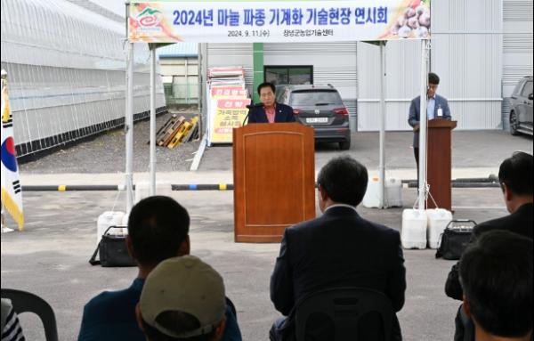 창녕군은 지난 11일 창녕군농업기술센터 내 시범포장에서 창녕군 마늘연구회원, 재배 농업인 및 농기계 제조업체 관계자 등 80여 명이 참석한 가운데 마늘 파종 기계화 현장 연시회를 열었다고 밝혔다.