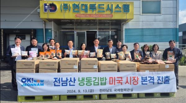 전남에서 생산된 냉동김밥이 해외시장에 본격 진출한다. 전라남도는 지역 1등 수출 품목인 김과 신선한 농산물을 활용해 전남만의 특색을 가진 냉동김밥이 최초로 출시돼 13일 미국 수출 선적식을 가졌다고 밝혔다.