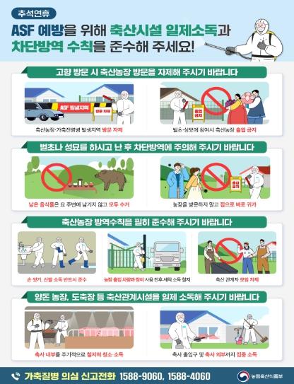 아울러, 축산관계자와 귀성객들을 대상으로 방역수칙과 협조사항도 적극 교육·홍보하고 있다. 문자메시지(SMS) 발송, 동영상 배포 등을 통해 축산관계자들에게 농장출입 차량 세척 철저, 농장 내부 출입 시 신발소독 등의 방역수칙을 안내하고 있으며, 매일 마을방송 송출, 전국 터미널·기차역 등에 현수막 1,119개 게시 등을 통해 귀성객·성묘객 등을 대상으로 ①축산농장 방문 자제, ②성묘 후 남은음식물 등 모두 수거, ③야생멧돼지 폐사체 신고요령 등 방역수칙과 유의사항을 집중적으로 홍보하고 있다.