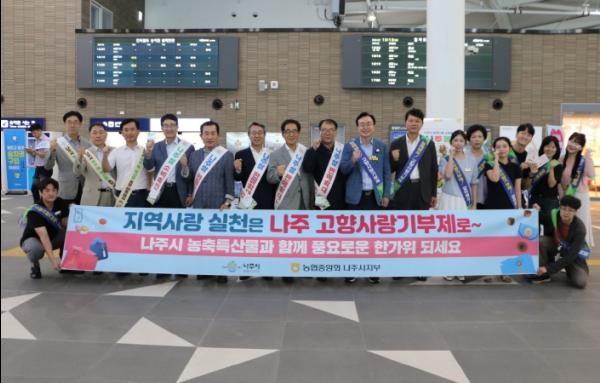 전라남도 나주시는 13일 나주역 대합실에서 추석을 맞아 고향을 찾는 귀성객과 시민을 대상으로 고향사랑기부제를 홍보하고 지역 농·축 특산물을 소개하는 환영 캠페인을 진행했다고 밝혔다.