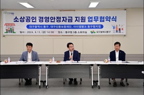 대구 동구청은 지난 13일, 대구신용보증재단, 대구은행 동구청지점과 소상공인 경영안정자금 지원 업무협약을 체결했다.