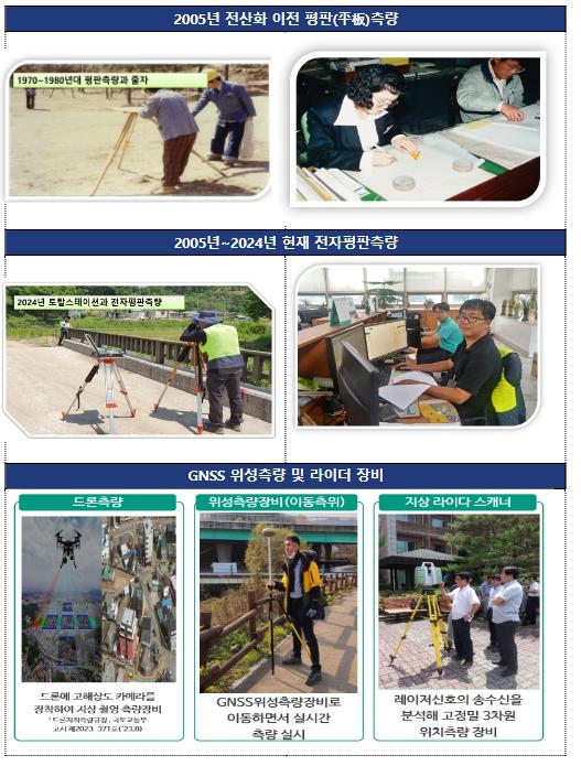 국토교통부는 ’82년부터 토지대장과 지적도를 전산화하는 작업을 추진했고(~’05년), 전산화된 도면을 기반으로 ’08년에는 전자평판과 GNSS, 지난해에는 지적측량분야에 드론을 활용할 수 있도록 함으로써 지적측량 서비스가 크게 향상되고 있다.