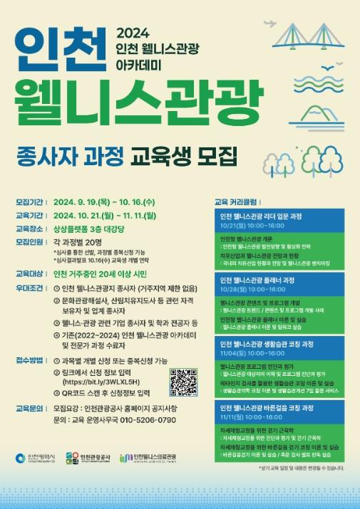 인천광역시와 인천관광공사는 인천 웰니스관광 전문 인력 양성을 위해 오는 10월 21일부터 11월 11일 까지 매주 월요일, 총 4회에 걸쳐‘2024 인천 웰니스관광지 종사자 교육’을 운영한다고 밝혔다.
