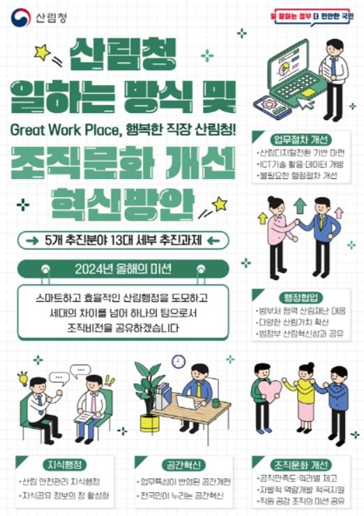 산림청은 ‘그레이트 워크 플레이스(Great Work Place) 만들기’를 기관이 지향하는 목표로 설정하고 꾸준히 조직문화 개선활동을 이어온 결과 2년 연속(2022년~2023년) ‘정부혁신평가 최우수기관’으로 선정된 바 있다.