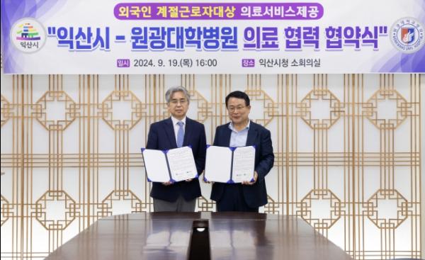 익산시는 19일 시청 소회의실에서 외국인 계절근로자의 진료 편의 강화를 위한 '익산시-원광대학교병원 의료 협력 협약식'을 개최했다.