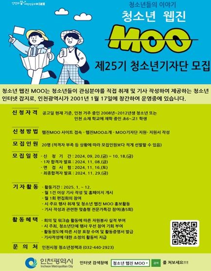 인천광역시는 인천시 청소년을 대표하여 2025년도 ‘웹진 MOO’를 이끌어갈 제25기 청소년기자단을 모집한다고 밝혔다.