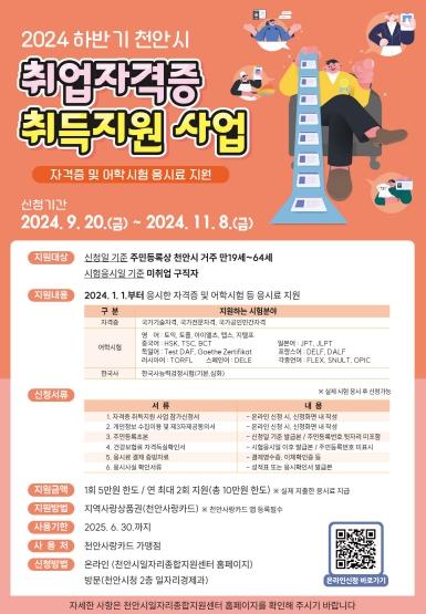 천안시는 구직자의 취업역량 개발을 지원하고자 ‘2024년 하반기 취업자격증 취득지원사업’을 추진한다고 20일 밝혔다.