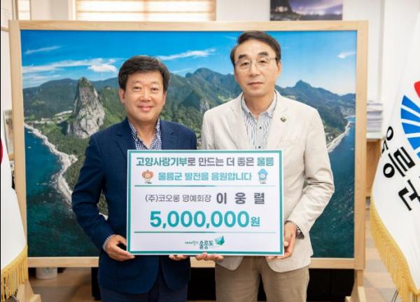 이웅렬 명예회장은 울릉군에 고향사랑기부제 최고한도액인 500만원을 쾌척하며 “집중호우로 피해를 본 울릉군에 고향사랑기부금으로 마음을 전하고 싶었다”고 말하며, “고향사랑기부제로 모인 모금액이 울릉도를 위해 의미있는 곳에 사용되기를 바란다”고 전했다.