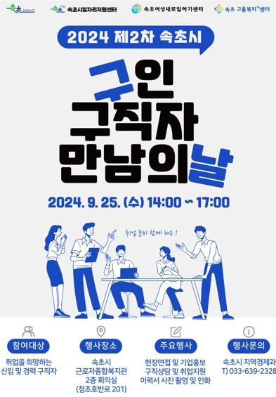 속초시는 오는 9월 25일 속초시 근로자종합복지관 2층 회의실에서 '2024년 제2차 속초시 구인·구직자 만남의 날' 행사를 개최한다.