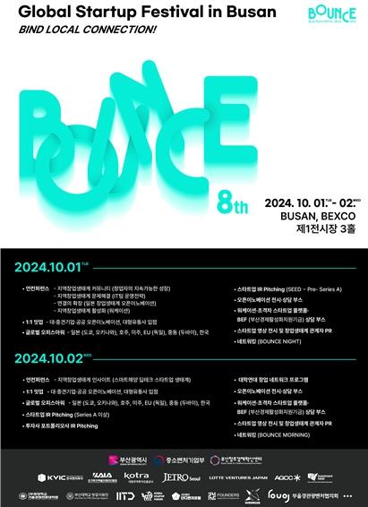 부산시는 오는 10월 1일, 2일 양일간 벡스코에서 지역 창업생태계를 연결하는 부산 대표 글로벌 신생기업(스타트업) 행사인 '바운스 2024(BOUNCE 2024)'를 개최한다고 밝혔다.
