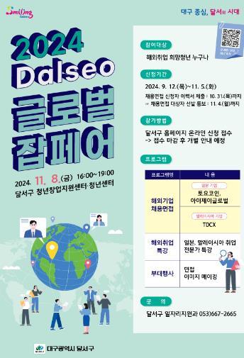 대구 달서구가 11월 8일 달서구 청년창업지원센터·청년센터에서 해외취업을 희망하는 청년들을 대상으로 '2024년 Dalseo 글로벌 잡페어'를 개최한다.