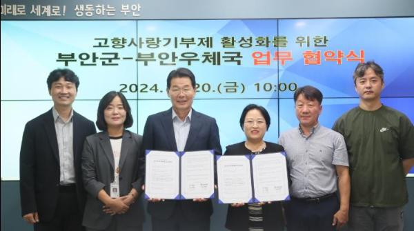 부안군과 부안우체국은 지난 20일 부안군청에서 고향사랑기부제 활성화를 위한 업무협약(MOU)을 체결하며 우체국 임직원들이 고향사랑기부금 250만 원을 기탁하는 뜻깊은 자리를 가졌다.