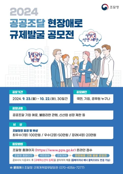 조달청은 국민과 기업의 눈높이에서 규제개선 과제를 발굴하고 해소하기 위하여 공공조달 현장규제 공모전을 개최한다고 밝혔다.