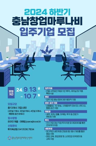 충남창조경제혁신센터는 충청남도로부터 위탁받아 운영하는 충남창업마루나비의 2024년 하반기 입주기업을 오는 10월 7일까지 모집한다고 밝혔다.