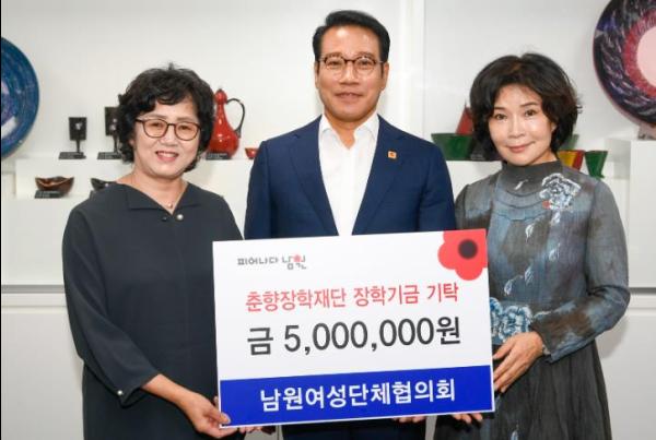 남원시여성단체협의회는 23일 지역의 어려운 학생들의 교육을 위해 써달라며 춘향장학재단에 500만원의 장학금을 기탁했다.