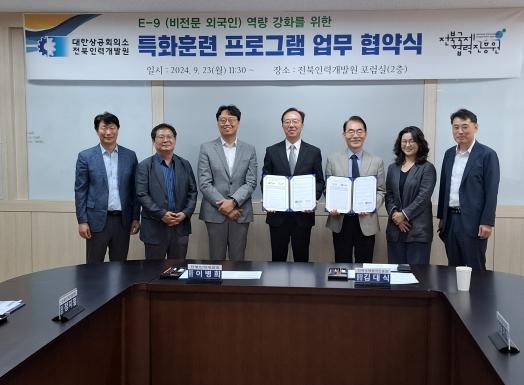전북국제협력진흥원과 대한상공회의소 전북인력개발원은 E-9(비전문취업) 외국인 근로자의 업무 적응과 기술 역량 강화를 위해 업무 협약을 체결했다.