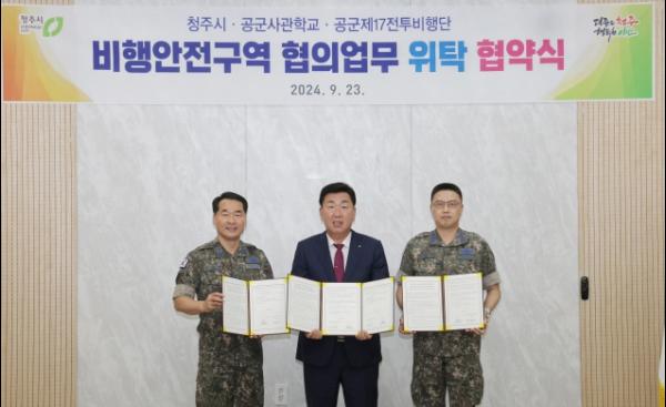 청주시는 23일 공군사관학교, 공군제17전투비행단과 비행안전구역 내 일정 높이 미만의 건축물 인허가 신청에 대해서는 건축 협의를 생략하는 내용의 업무 위탁 합의서를 체결했다.