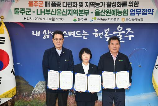 울산시 울주군이 23일 한국토지주택공사(LH) 부산울산지역본부, 울산원예농협과 울주배 품종 다변화와 지역농가 활성화를 위한 업무협약을 체결했다.