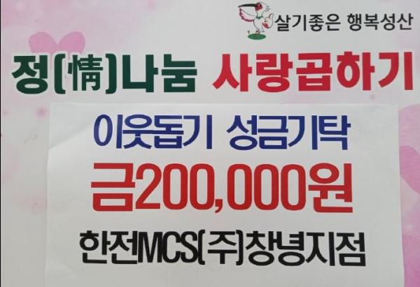 창녕군 성산면은 지난 23일, 한전MCS(주)창녕지점이 지난 5월에 이어 저소득 취약계층 돕기 성금 20만 원을 기탁했다고 밝혔다.