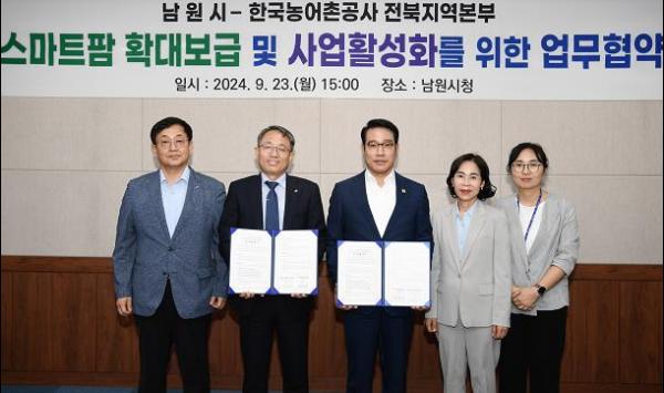 이날 협약식은 최경식 남원시장, 이정문 한국농어촌공사 전북지역본부장님을 비롯한 양 기관 업무관계자가 참석한 가운데 진행됐으며, 스마트농업 육성지구에 대해 상호협력 협의 및 청년농 모집, 설계·시공·감리시 상호 유기적인 협의 등을 담은 업무협약을 맺었다,