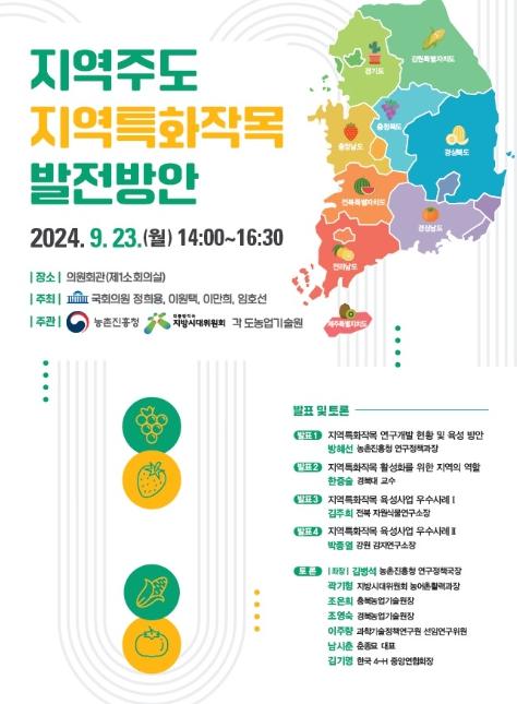 농촌진흥청은 9월 23일 국회 의원회관에서 지역특화작목의 발전 방안을 논의하기 위한 국회 토론회를 개최했다. 정희용, 이원택, 이만희, 임호선 국회의원이 공동 주최하고, 농촌진흥청, 지방시대위원회 및 9개 도 농업기술원이 주관한 이번 토론회는 지역 주도의 균형발전과 자립적 성장을 지속해서 지원하기 위해 산?학?관?연의 협력 방안을 모색하는 자리였다.
