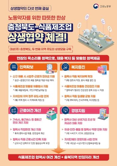 충북지역의 식품제조업에서 원·하청의 상생과 협력의 밥상이 차려진다. 고용노동부는 24일 괴산 자연드림파크에서 충청북도, 진천군, 괴산군, 음성군, 대상(주) 및 협력사와 함께 ‘격차 완화와 약자 보호’를 위한 충청북도-식품제조업 상생협약을 체결했다.