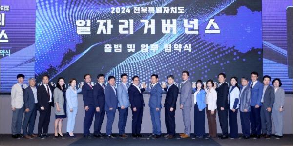 전북자치도에 따르면 24일 전주 그랜드힐스턴 호텔에서 김관영 전북특별자치도지사, 서거석 전북특별자치도교육감, 황정호 전주고용노동지청장, 안태용 전북지방중소벤처기업청장 등 22개 유관기관 대표 등이 참석한 가운데 ‘전북특별자치도 일자리 거버넌스’ 출범 및 업무협약식이 개최됐다.
