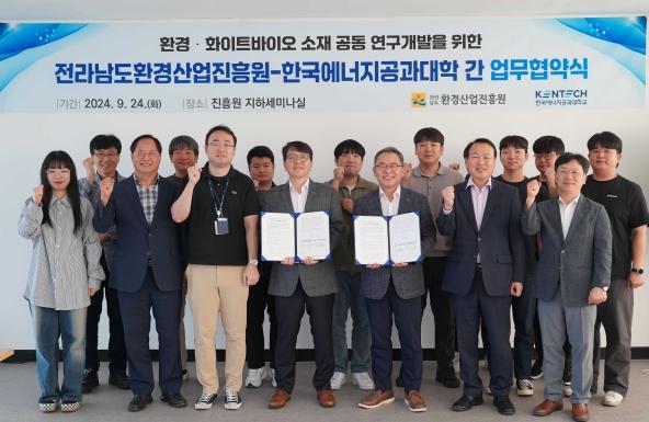 전라남도환경산업진흥원은 24일 진흥원에서 한국에너지공과대학 바이오업사이클링센터가 버려지는 농업 부산물을 활용해 미래 화이트바이오 신소재 실증연구 개발협약을 했다.